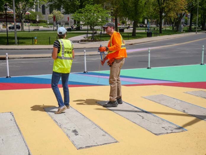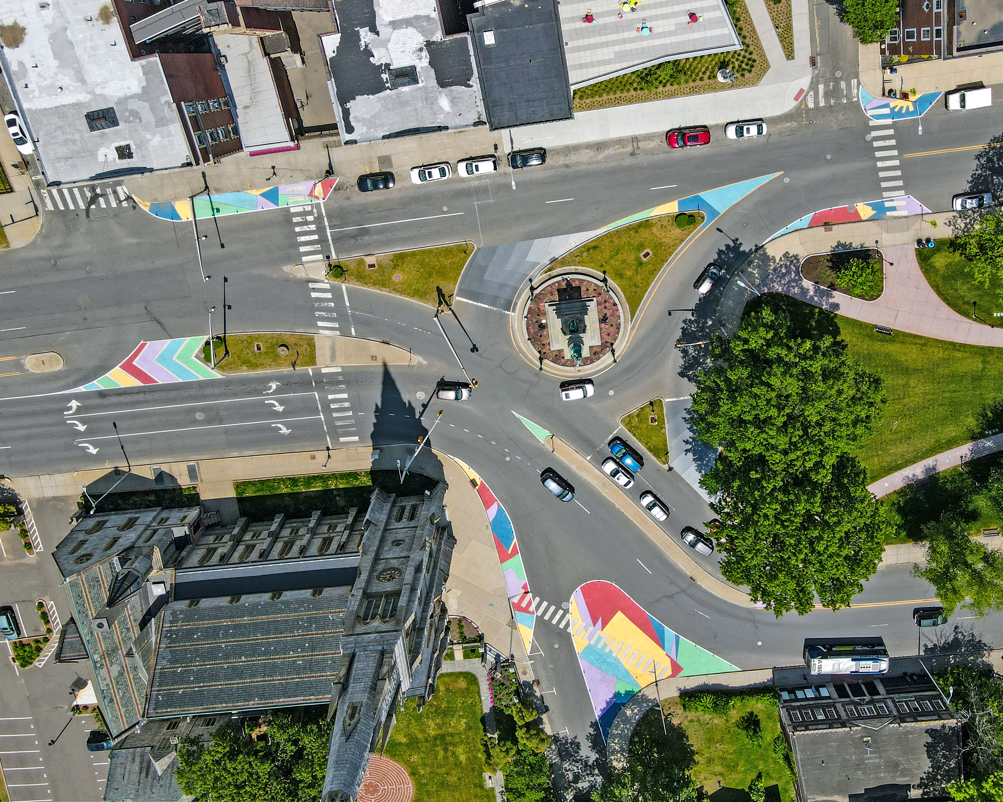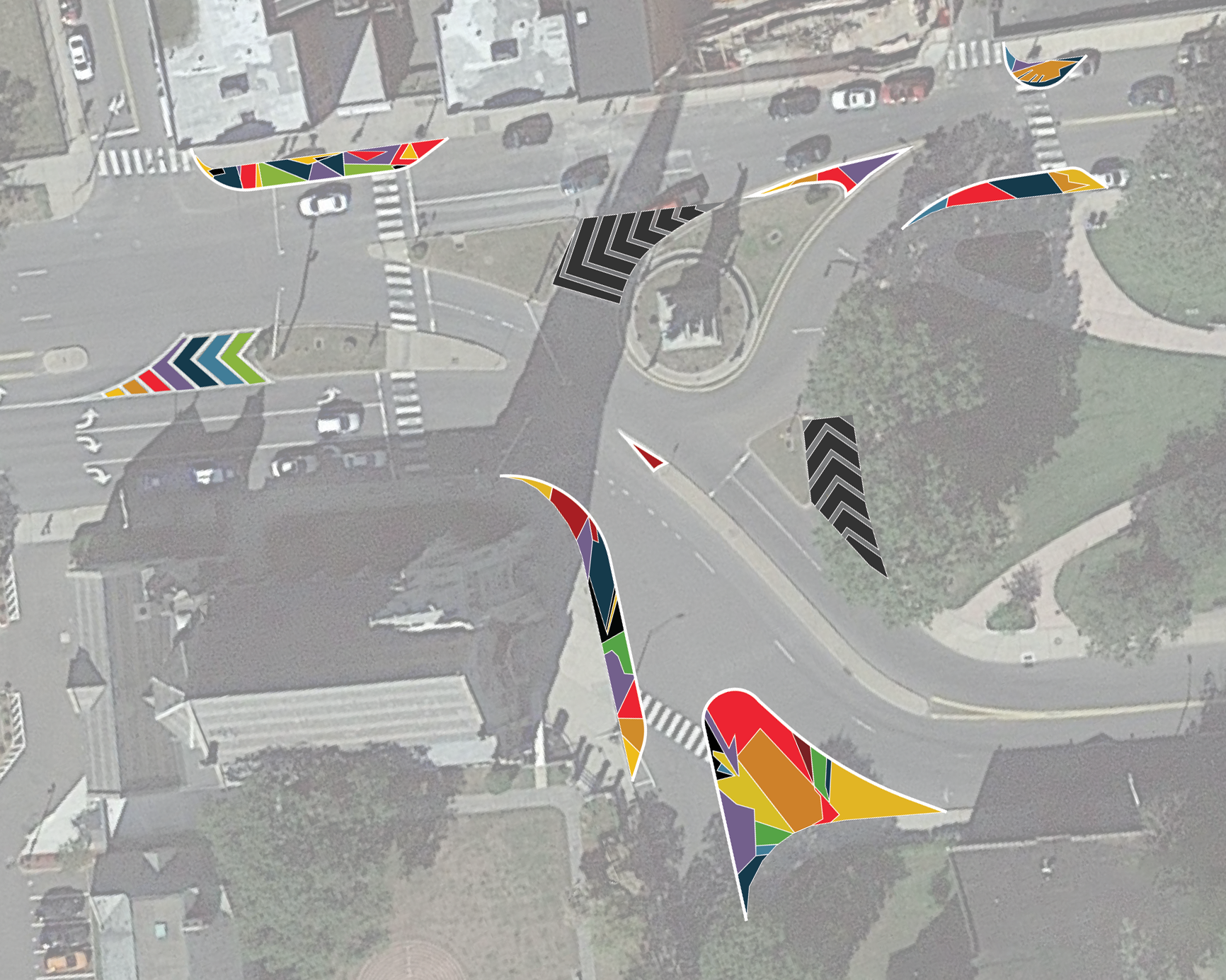 The vibrant colors and patterns within the painted bump-outs were inspired by local artist Kristin Baker's "The Unfair Advantage," a piece found at the nearby Mattatuck Museum. The striking design and flexible delineator posts further help define the intersections and reduce crosswalk distances on roads surrounding the area.